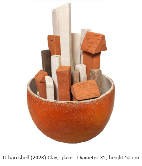 The statue was prepared for an exhibition in honor of the 120th anniversary of the city of Kfar Saba (2023)This Half-Orange with “Houses” sculpture juxtaposes organic form and urban architecture, suggesting both nourishment and consumption. The hollowed orange—its interior replaced by structures speaks to cycles of growth, displacement, and transformation. What was once agrarian becomes metropolitan; what fed the body now shelters it.The work operates as a meditation on adaptation and impermanence. The peel, fragile yet intact, cradles a new reality within its curves. Here, nature and civilization are not opposites but stages in an ongoing process of assimilation and change. The piece invites reflection on what is preserved, what is discarded, and what emerges in the space between.The statue is placed on permanent display in the archeological- historical museum in the city of Kfar Saba.